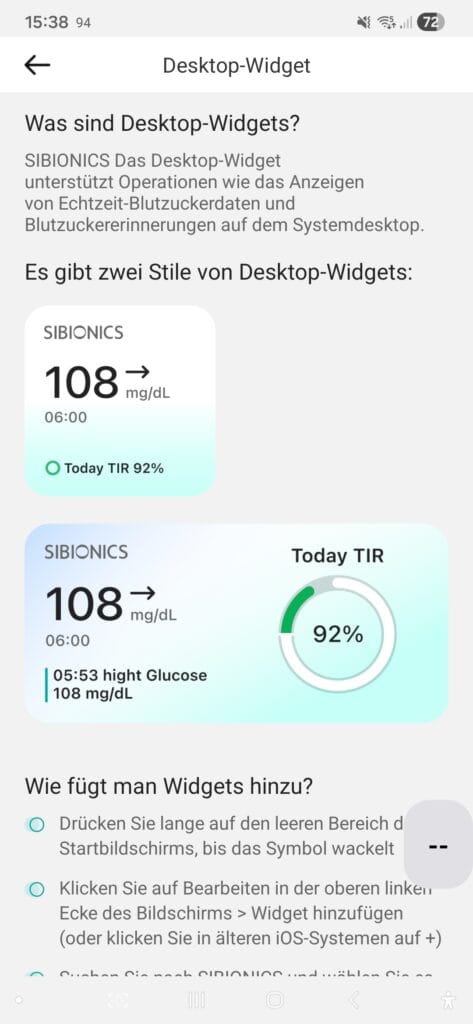 Das Widget aktualisiert sich nicht immer zeitnah, manchmal zeigt es keine Werte, aktualisiert sich dann aber flott, manchmal zeigte es TIR = 0 an…. ein kleiner, unwichtiger Bug, der sich beim Öffnen des Widgets sofort löst.