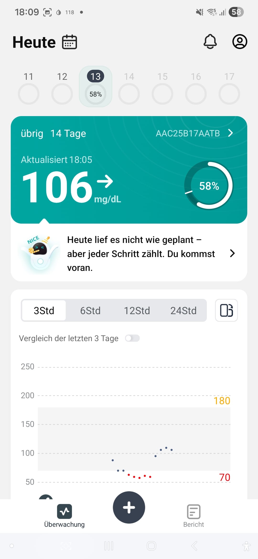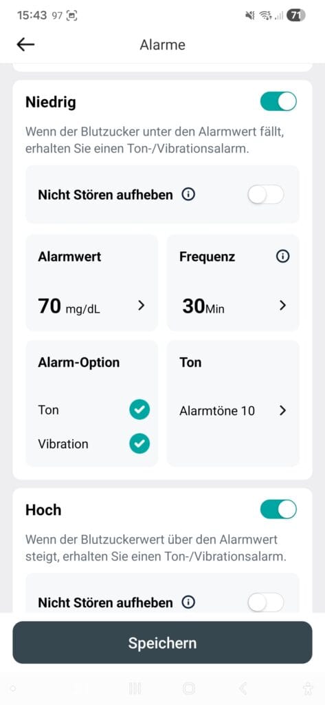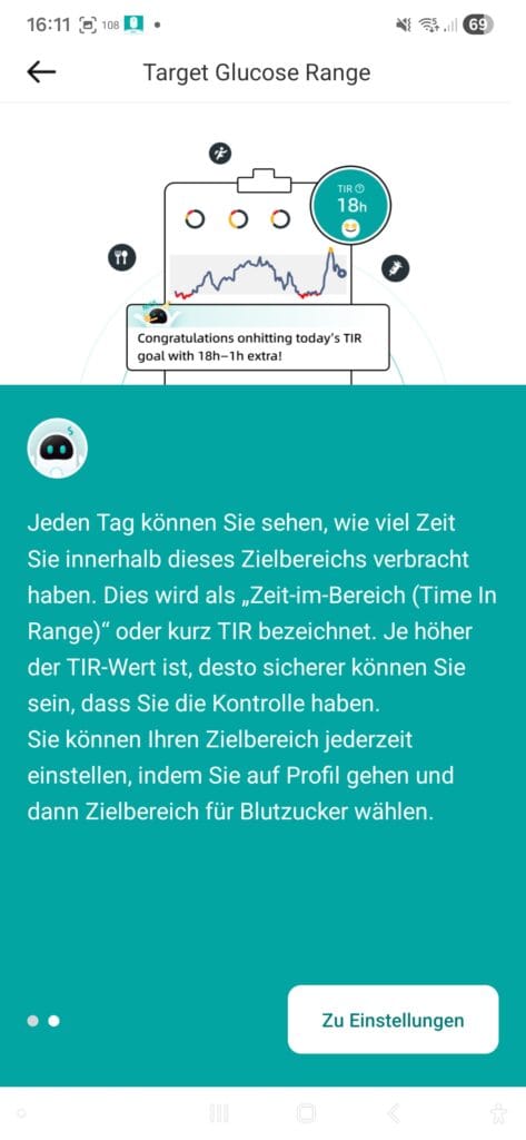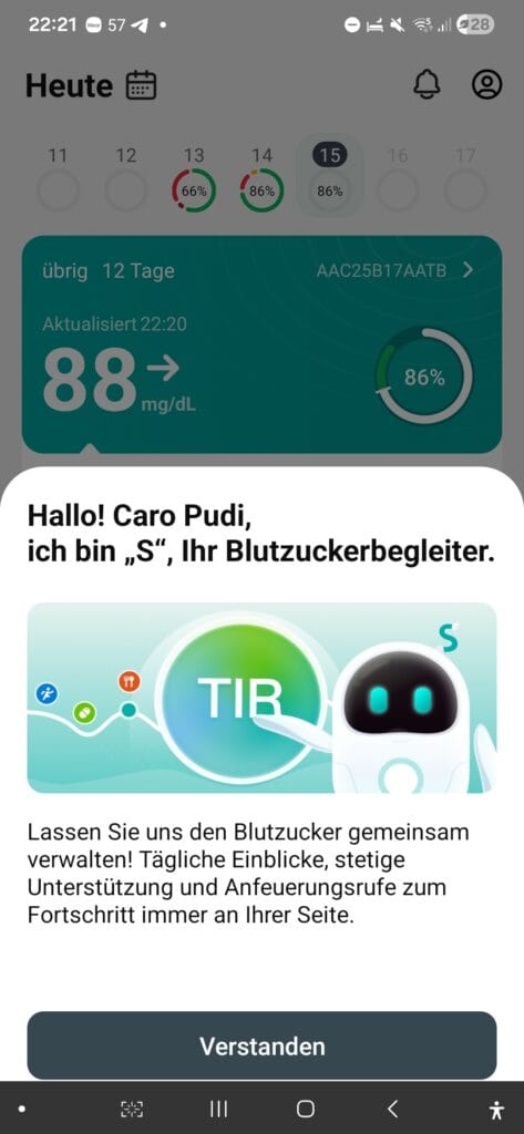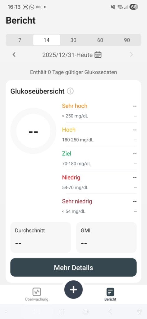 Gefehlt hat mir manchmal, dass es keine Anzeige über das Alter des Wertes gibt… also wie aktuell ist der letzte gelesene Wert. Auch kann ich in der App nur 70% TiR als Ziel definieren… was sich aber nur auf die Anzeige und die Statistiken bezieht. Zwei Tage vor Sensor-Ende wird eine Benachrichtigung angezeigt – das ist hilfreich! Leider folgt danach keine Warnung mehr vor dem Laufzeit-Ende – hier fände ich eine Warnung 12 oder 6 Stunden vorher nochmals hilfreich! Auch bei Ablauf des Sensors wird man nicht benachrichtigt. Das finde ich nun gerade richtig blöd 🫢😪!