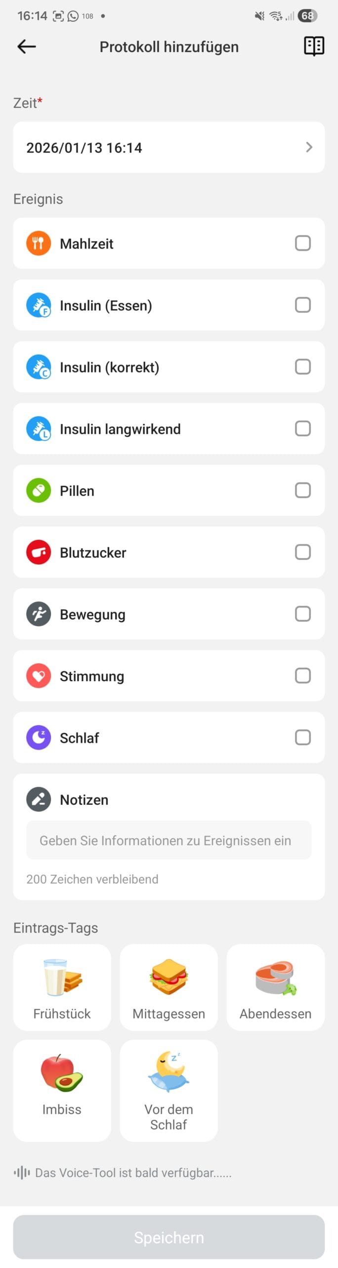 Man hat auch die Möglichkeit, verschiedene Notizen einzugeben, so etwa für Sport, Mahlzeiten, Insuline, Schlaf, Stimmung, Medikamente oder individuell über die Freihandeingabe. Mahlzeiten kann man per Sticker (für jede Mahlzeit), per Foto und über die Eingabe der Kohlehydrate dokumentieren. Die Protokolle, wie die Eintragung von Sport etc pp., lassen sich auch im Nachhinein noch editieren! Berichte lassen sich einfach per Mail versenden. Auch kann man seine Daten für Behandler mit Klinik-ID frei geben. Die Follower-Funktion ist angelegt, funtionierte aber aktuell noch nicht.